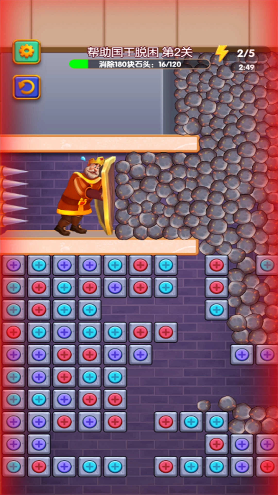 关卡目标:每一关都有规定的石头消除数量要求,只有在限定步数内达成目标,才能成功救出国王。