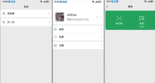 在“发现”与“我的”这两个界面中,均仅设有两个简洁的功能入口;即便进入服务页面后,也只有顶部的收付款和钱包这两项选择。