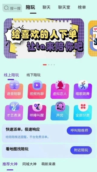 2、陪玩服务涵盖语音陪聊、视频热聊、虚拟恋人、唱歌跳舞等丰富形式,种类十分齐全,能够充分满足用户多样化的陪伴需求。