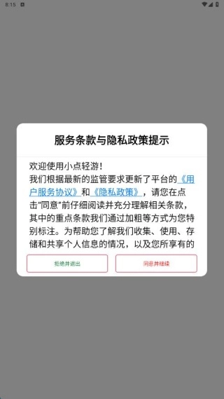 1、安装后查看用户协议和隐私政策,点击同意进入。