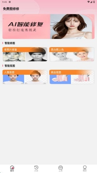 1、安装进入首页,平台带来了智能修图和抠图功能,免费开启。