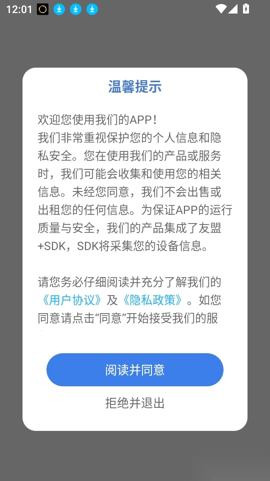 1、首先打开应用点击“阅读并同意”按钮来进入中。