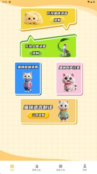 1、首页带来了猫咪、人声录音和翻译服务,让你知晓猫咪各类叫声所表达需求。