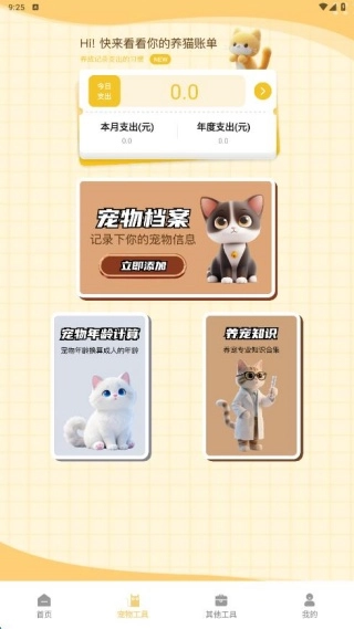 2、在宠物工具页面,支持宠物档案、年龄计算、养宠知识等板块。