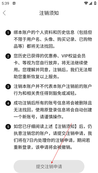 4、进入注销须知页面后,请仔细阅读相关内容,随后点击【提交注销申请】按钮,即可完成账号注销操作。