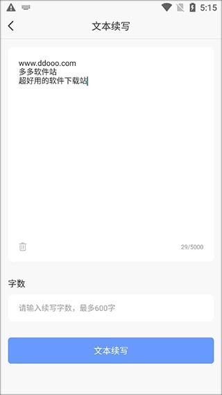 进入AI续写界面后,先输入想要续写的文字内容,接着确认好需要续写的字数,最后点击底部的【文本续写】按钮即可完成操作。