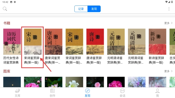 2、在发现板块页面,点击宋诗鉴赏辞典新一版书籍条目,进入书籍详情页。