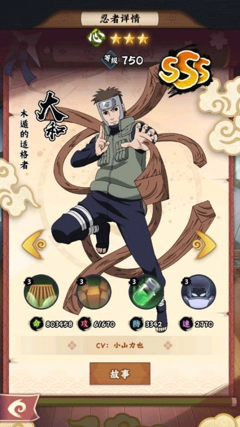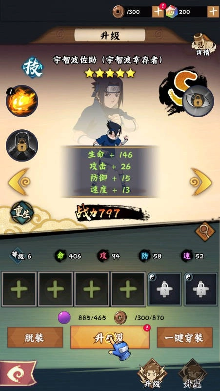 4、游戏里的资源包含金币、查克拉、忍者碎片等,新手阶段千万不要分散使用。要优先提高核心输出角色的等级和装备,保证战斗效率。