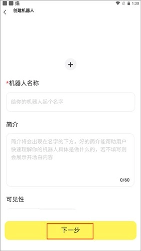 2、填写机器人的名称与简介,勾选可见性选项后,进入下一个步骤。