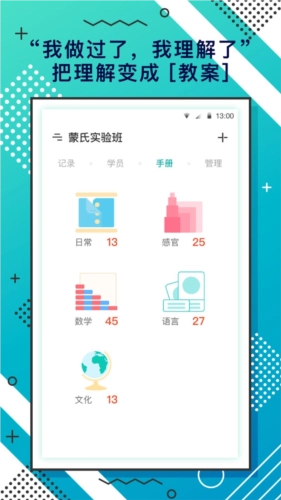 4、蒙氏手记软件配备了手册功能,按日常、感官、数学、语言、文化等领域进行划分,每个领域都可设置相应的内容板块。