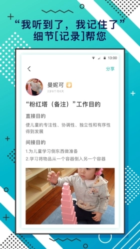 3、蒙氏手记软件集成了记录、教案、整理分享等丰富功能,能够助力教师高效完成日常记录工作。