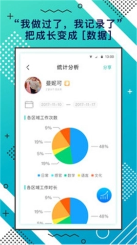 1、蒙氏手记软件借助统计图的呈现形式,使用户能够清晰查看各项内容的详细百分比情况,从而了解每天的时间消耗分布,进而帮助调整工作与作息安排等。