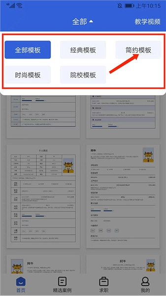 2、包含全部模版、经典模版、简约模版、时尚模版以及院校模版等各类简历模版,用户能够依据自身需求挑选对应的类型,此处以【简约模版】为例进行说明。