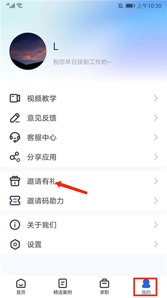 1、打开简历牛,在【我的】界面,选择【邀请有礼】选项,