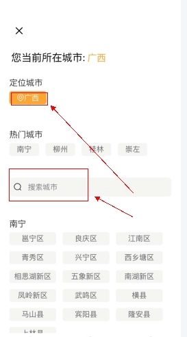 2、手动输入搜索或者系统定位城市,选中即可
