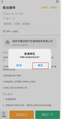 2、再次点击确定就能完成简历投递啦!