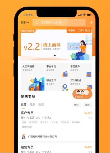 桂聘是广西桂聘网络科技有限公司打造的广西本土求职平台,覆盖桂林、柳州、南宁等全广西区域,提供兼职、全职、实习及跳槽等各类就业机会。平台实现求职者与招聘方的精准对接,支持随时随地与HR沟通,助力快速入职。作为专业的人才招聘网站,桂聘人才网受到全广西(含桂林、柳州、南宁)众多企业和人才的青睐。除为用人单位提供劳动保障咨询、业务外包、劳务派遣等专业人力资源服务外,还为求职者精准匹配岗位,筛选推荐高薪优质职位。