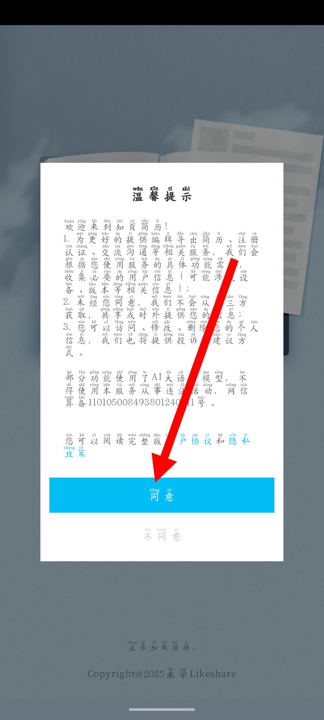 1、打开知页简历,在温馨提示页面,点击同意。