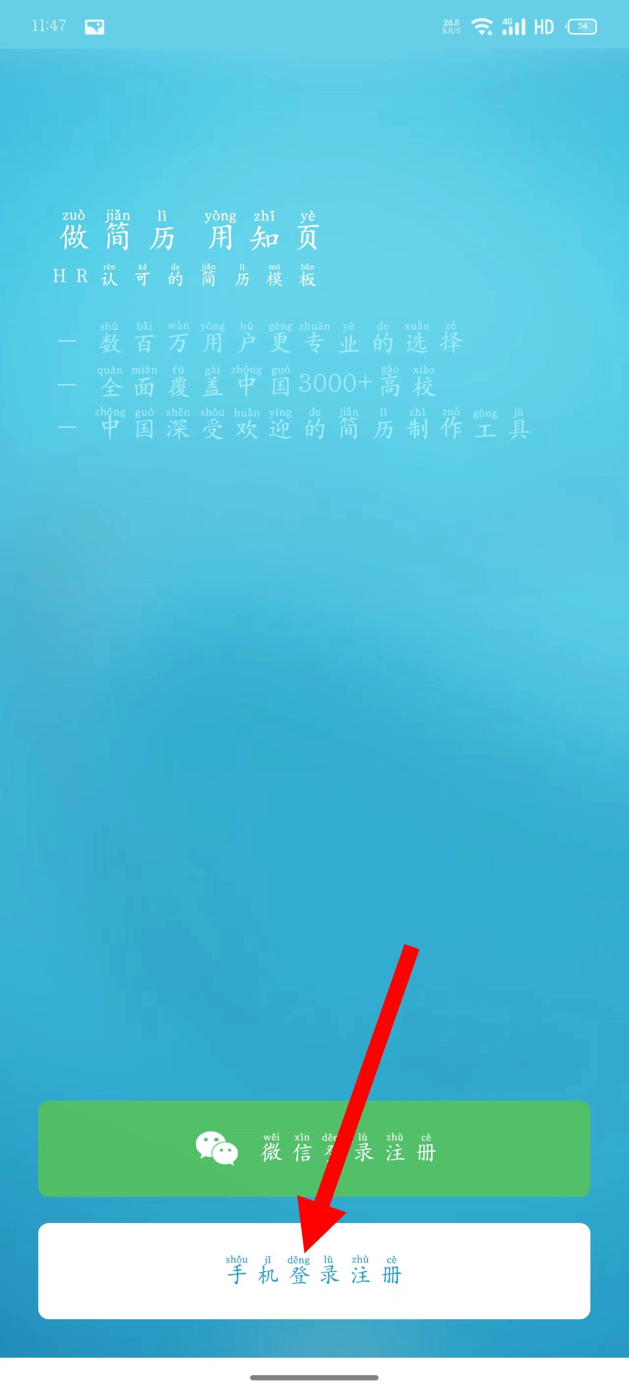 2、进入登录注册页面后,点击手机登录注册。