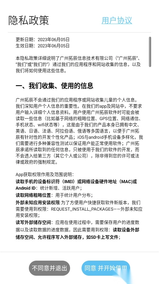 1.打开软件阅读“隐私政策、用户协议”点击“同意并开始使用”进入