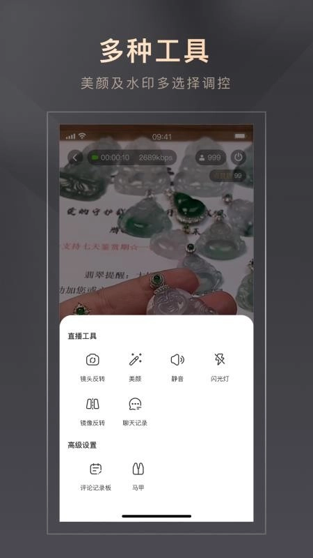 还为用户配备了各类直播工具,这些工具均可按需选用,能让用户便捷地完成美颜设置与水印添加。