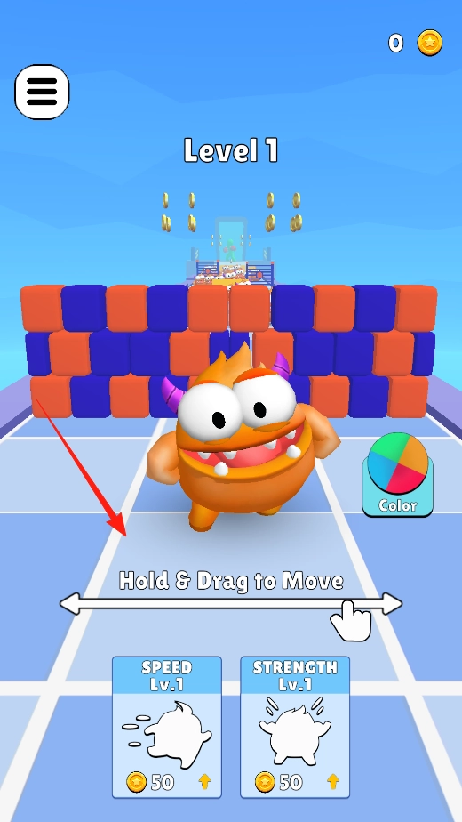1、按住并拖动控制角色移动,在路径上躲避障碍收集金币,提升速度与力量属性,体验移动操控机制。