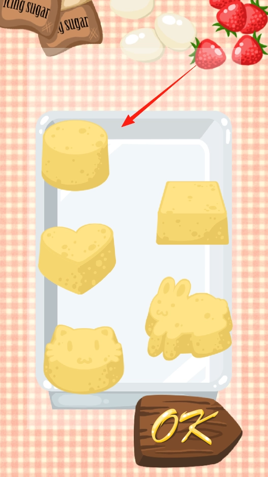 2、挑选蛋糕胚放入烤盘,准备烘焙,点击OK推进制作步骤,体验基础烘焙玩法。