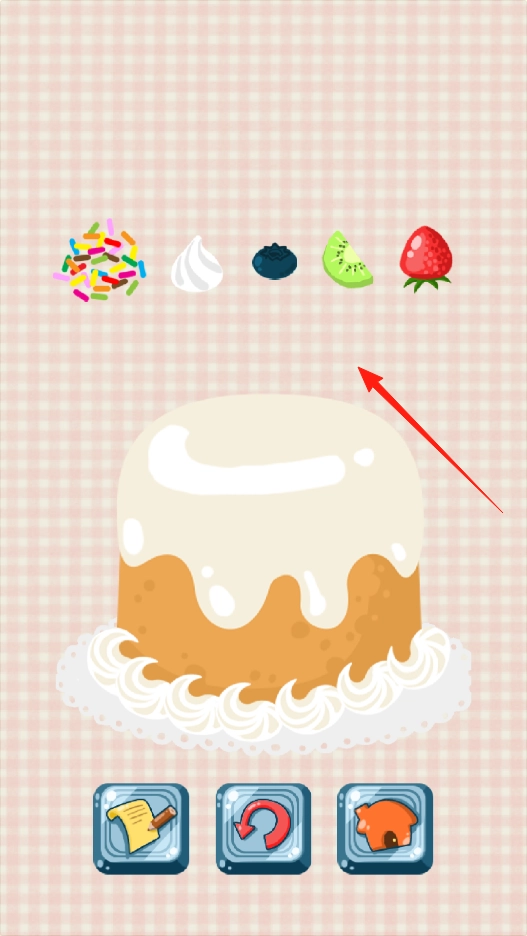 3、拖动装饰,布置蛋糕,添加水果糖屑,设计外观完成创意装饰,体验甜品装饰机制。