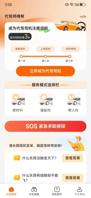2、针对代驾工作中可能出现的安全隐患,配备一键紧急求助功能,还附带夜间偏僻路段的应对指南,多方面保障司机的人身安全。