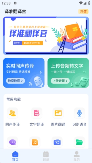 1、在首页提供实时同声传译、上传音频转文字的功能,还有很多常用功能;