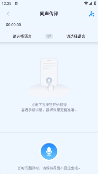 2、进入同声传译页面后,点击下方的语音按钮即可启动翻译功能;建议靠近手机讲话,这样能让翻译效果更精准哦。