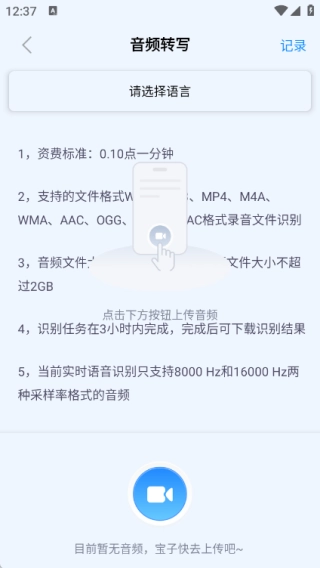 3、在音频转写的页面中可以选择语音,然后上传音频进行识别;