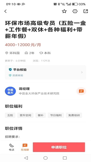 4、在线了解每个岗位的详情,对比薪资等,满意就可以在线联系,并且申请职位。