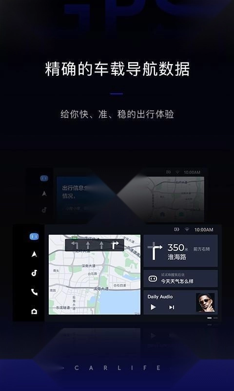 CarLife+完美百度地图,又全又准的海量地点信息;实时路况智能播报,告别拥堵和罚单.