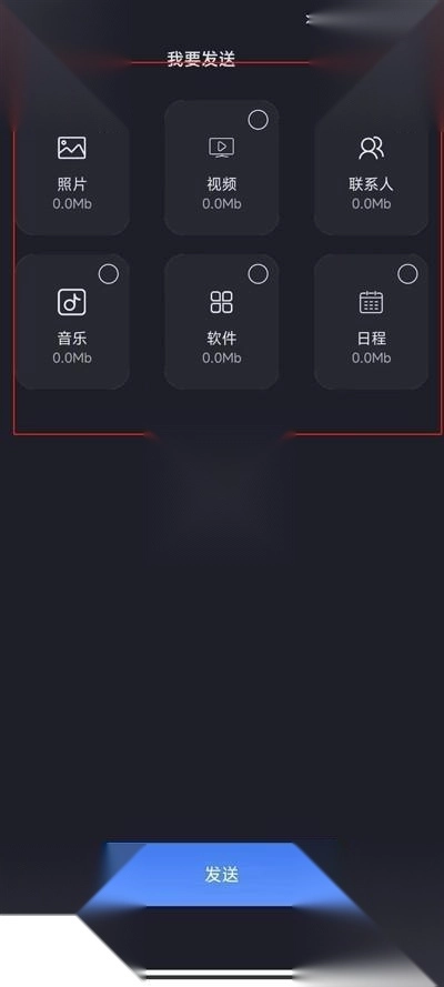 进入发送页面后,能看到六项内容选项,根据实际需求选择相应选项后,点击页面底部的发送按钮,即可启动互传功能。