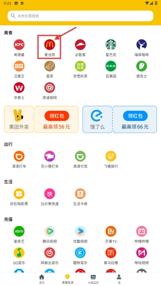 2、在本地生活页面,选择麦当劳分类,进入麦当劳服务页面。