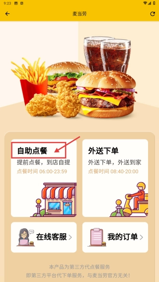 3、在麦当劳服务页面,点击自助点餐选项,进入选择餐厅页面。