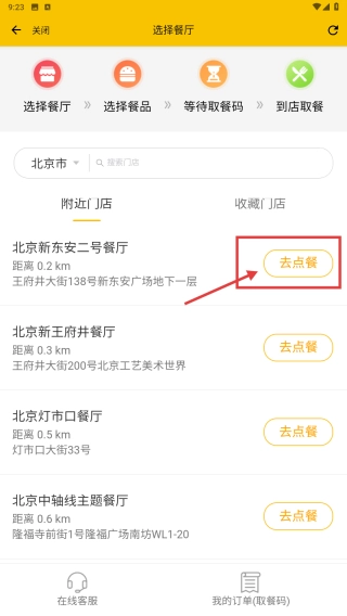 4、选择北京新东安二号餐厅,点击去点餐按钮,进行点餐操作。