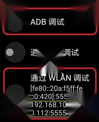 3、进入开发者选项界面后,开启“ADB调试”与“通过WLAN调试”功能。请留在当前界面,记录下黄圈所标记的IP地址及端口号。