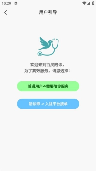 3、依据指引快速选定是作为普通用户寻求陪诊服务,还是以陪诊师身份入驻平台承接订单,操作简单易上手。