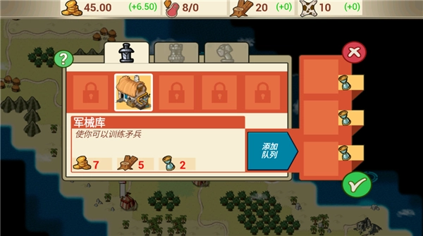 要是满足相关要求,底部就会出现一个蓝色按钮,点击它就能开展建造或升级操作,同一时间里你最多可以建造3个建筑。