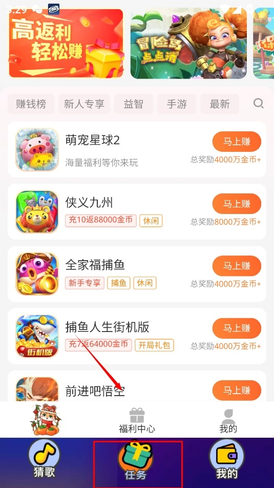 1、先在游戏里点击下方的“任务”来切换页面,接着选择福利中心