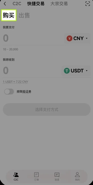 一、打开pi派币首页-点击C2C买币-快捷买币-点击购买-选择需要购买的数字资产