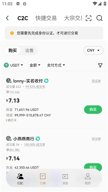 5、在搜索框输入CNY,选择支付方式,选择合适的商家就可以购买USDT