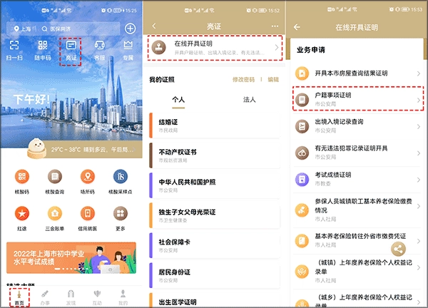 1、通过实名认证登录“随申办市民云”平台→在首页找到并点击“亮证”功能→接着选择“在线开具证明”选项→最后点击“户籍事项证明”即可进入对应的申请界面。
