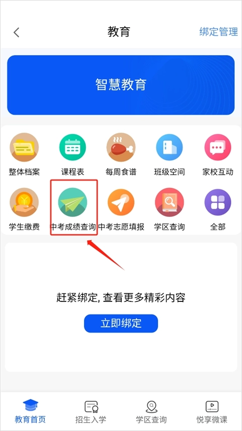 2、在“教育”页面选择“中考成绩”。