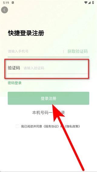 3、在快捷登录注册页面,输入手机号,点击获取验证码。