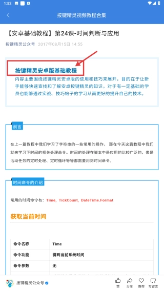 4、在教程详情页面,可查看针对按键精灵安卓版时间判断命令的专业解析,内容包含通过Time命令获取当前系统时间等与时间判断相关的知识要点及实际应用场景。