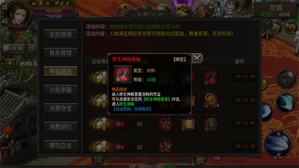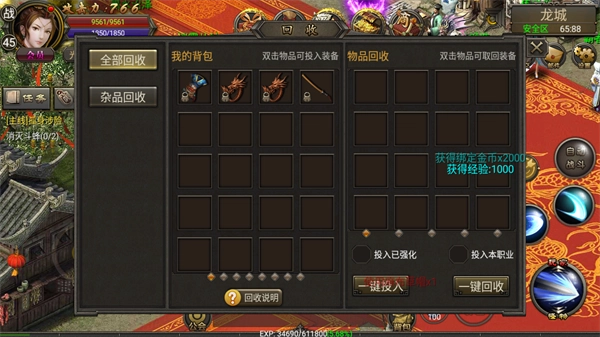 2、装备回收:低级装备回收可获取大量经验,每次击杀怪物掉落的装备(无论等级高低)都要全部拾取,等背包攒满后前往龙城装备回收员处进行回收。