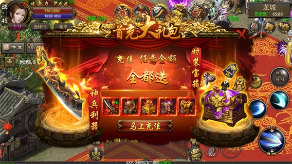 4、最后感兴趣的玩家还可以开启首充奖励,领取神兵利器。